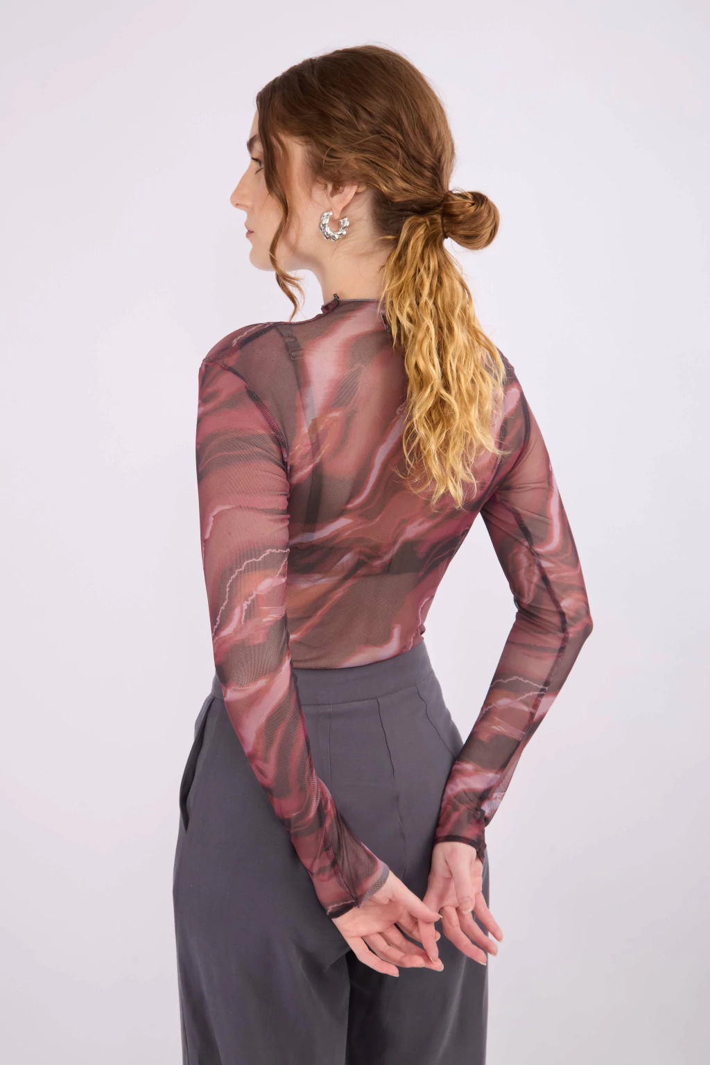 Este body de manga larga presenta delicados frunces en el delantero, confeccionado en microtul con una estampa exclusiva de Miuz. Su diseño único combina estilo y comodidad, convirtiéndolo en una prenda esencial para tu guardarropa.