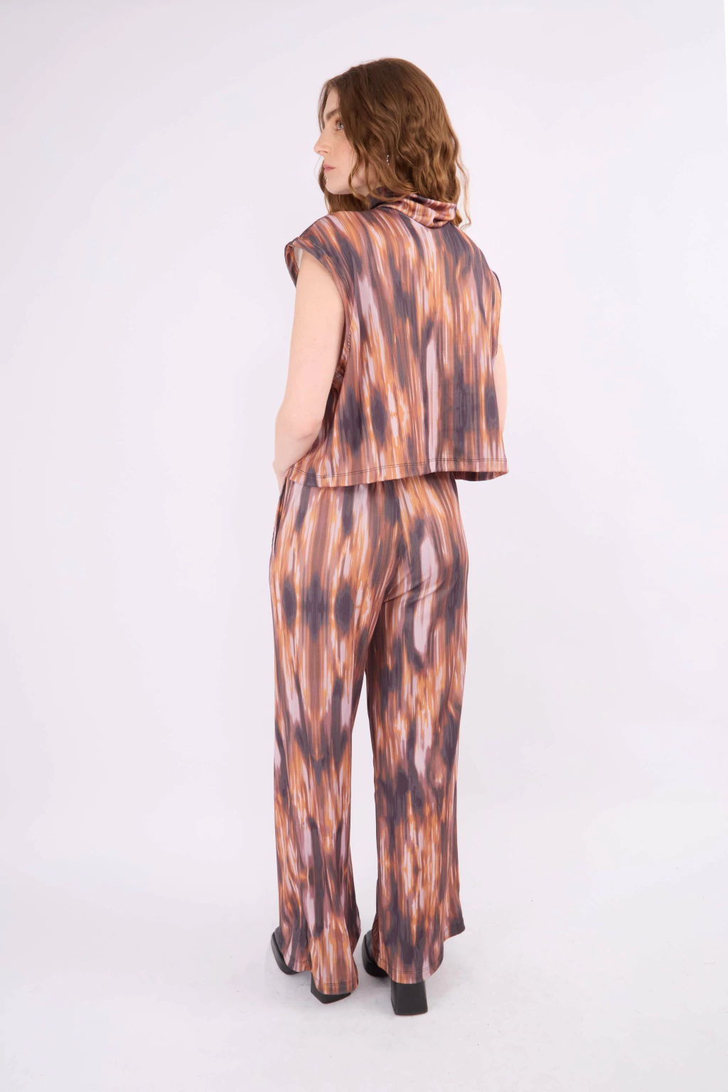 Combiná el pantalón con el top Bruma del mismo estampado para un look coordinado y moderno. La modelo utiliza el talle M para lograr un efecto más oversize, ideal para un estilo relajado.